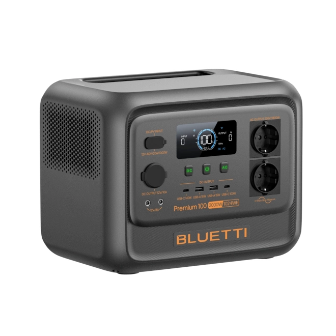 BLUETTI Premium 100 V2 to kompaktowa stacja zasilania o klasie energetycznej ~1 kWh, zaprojektowana jako kompletne źródło prądu dla zastosowań domowych, mobilnych i pół-off-grid. Konstrukcja integruje w jednej obudowie falownik AC, sekcję DC, szybkie ładowanie z sieci oraz kontroler PV (MPPT), co upraszcza wdrożenie i ogranicza liczbę zewnętrznych akcesoriów. Model ten jest sprzętowo tożsamy z wariantem globalnym „Elite 100 V2”, a różnice sprowadzają się do nazewnictwa i kompletacji rynkowej - merytorycznie opis dotyczy tego samego urządzenia. W praktyce oznacza to przewidywalne zachowanie przy typowych profilach obciążenia, z sensownym marginesem mocy na rozruch odbiorników o wyższym prądzie startowym.